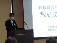 前田教育長からは、確かな学力の育成を目標に、ICTを活用した授業や特別支援教育、働き方改革やふるさと松山学の推進など、松山市教育委員会が一丸となって取り組む教育活動について話がありました。また、誠意をもち、明るく生き生きと目の前の子どもたちと関わり、子どもから学ぶ姿勢を大切にと、これからの松山の教育を担う先生方へのエールが送られました。